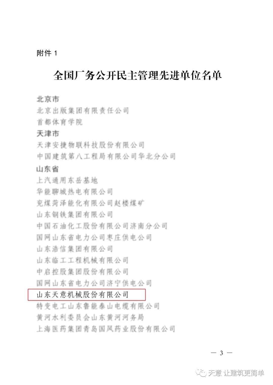 12月11日,從全國(guó)總工會(huì)傳來(lái)喜訊,山東天意機(jī)械股份有限公司被授予“全國(guó)廠務(wù)公開(kāi)民主管理先進(jìn)單位”稱號(hào)。