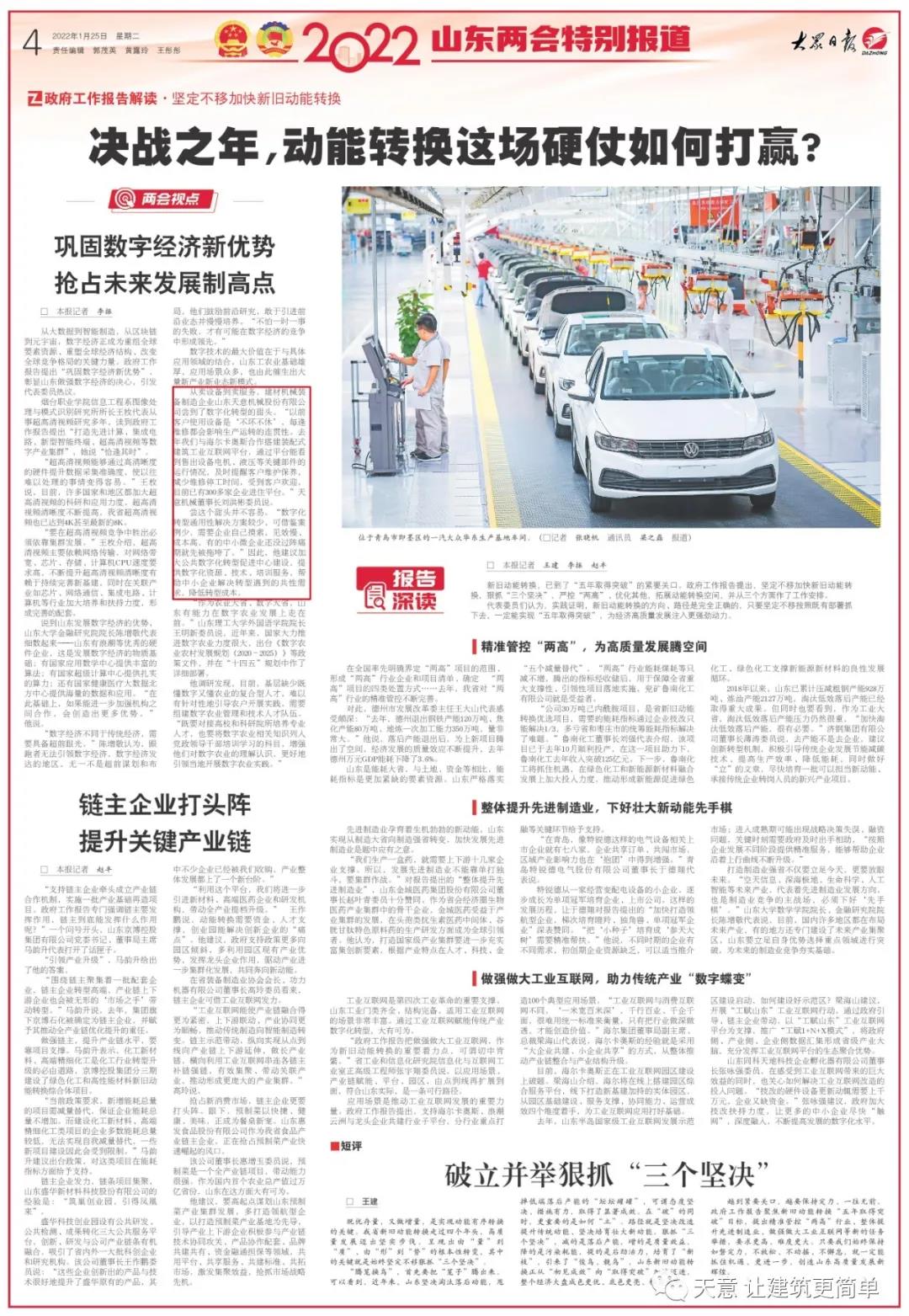會(huì)議期間,劉洪彬提交了《關(guān)于加快山東省中小企業(yè)數(shù)字化轉(zhuǎn)型的建議》的提案,并就數(shù)字化轉(zhuǎn)型的相關(guān)內(nèi)容接受了大眾日?qǐng)?bào)記者的采訪。劉洪彬告訴記者,“以前客戶使用設(shè)備是‘不壞不休’,每逢維修都會(huì)影響生產(chǎn)運(yùn)轉(zhuǎn)的連貫性。去年我們搭建了裝配式建筑工業(yè)互聯(lián)網(wǎng)平臺(tái),通過(guò)平臺(tái)能看到售出設(shè)備電機(jī)、液壓等關(guān)鍵部件的運(yùn)行情況,及時(shí)提醒客戶維護(hù)保養(yǎng),減少維修停工時(shí)間,受到客戶歡迎,目前已有300多家企業(yè)進(jìn)駐平臺(tái)。“數(shù)字化轉(zhuǎn)型通用性解決方案較少,可借鑒案例少,需要企業(yè)自己摸索,見效慢、成本高,有的中小微企業(yè)還沒(méi)過(guò)陣痛期就先被拖垮了。”因此,他建議“加大公共數(shù)字化轉(zhuǎn)型促進(jìn)中心建設(shè),提供數(shù)字化資源、技術(shù)、培訓(xùn)服務(wù),幫助中小企業(yè)解決轉(zhuǎn)型遇到的共性需求,降低轉(zhuǎn)型成本。”