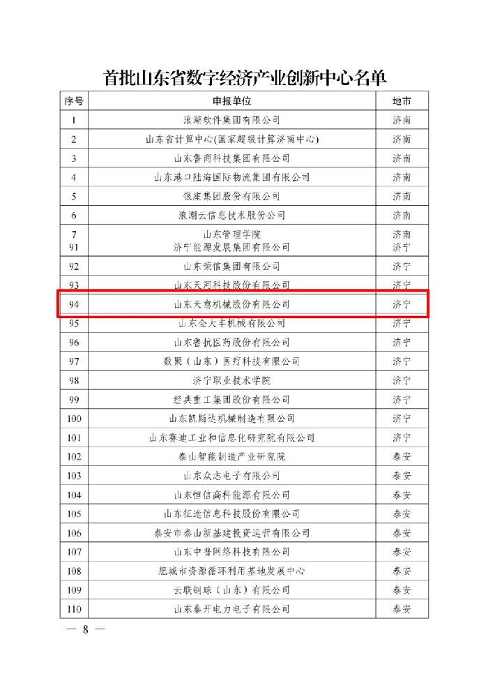 6月,省工信廳公布了首批山東省數(shù)字經(jīng)濟創(chuàng)新平臺名單,天意機械入選首批數(shù)字經(jīng)濟產(chǎn)業(yè)創(chuàng)新中心名單。