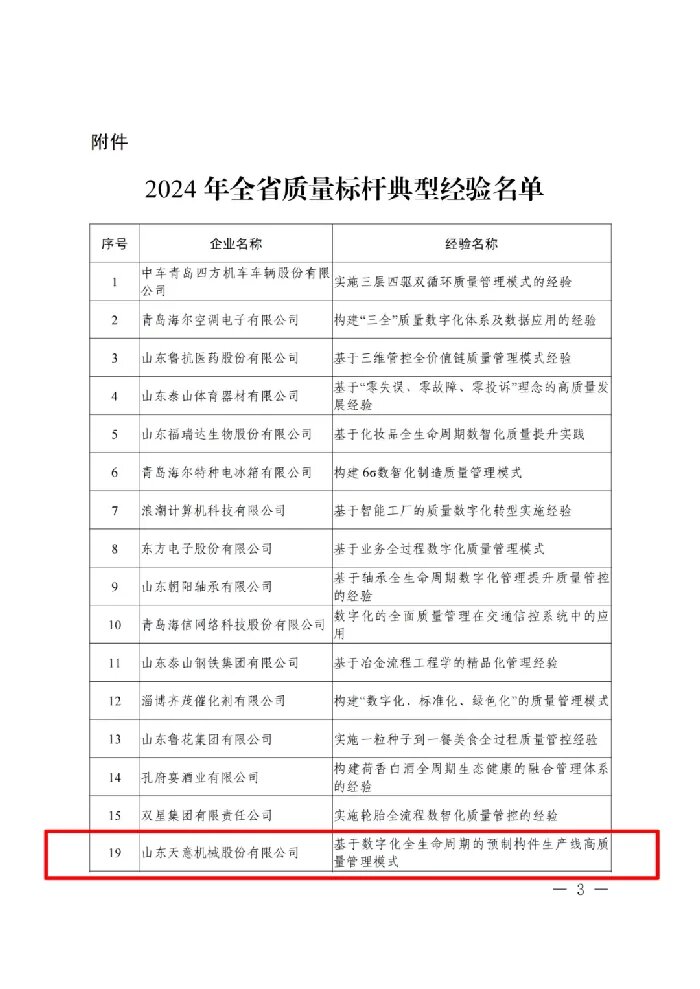 7月,山東省工業(yè)和信息化廳公布了全省質量標桿獎。天意機械憑借在關鍵過程質量控制方向的不懈探索,以基于數(shù)字化全生命周期的預制構件生產(chǎn)線高質量管理模式斬獲“2024年全省質量標桿”。