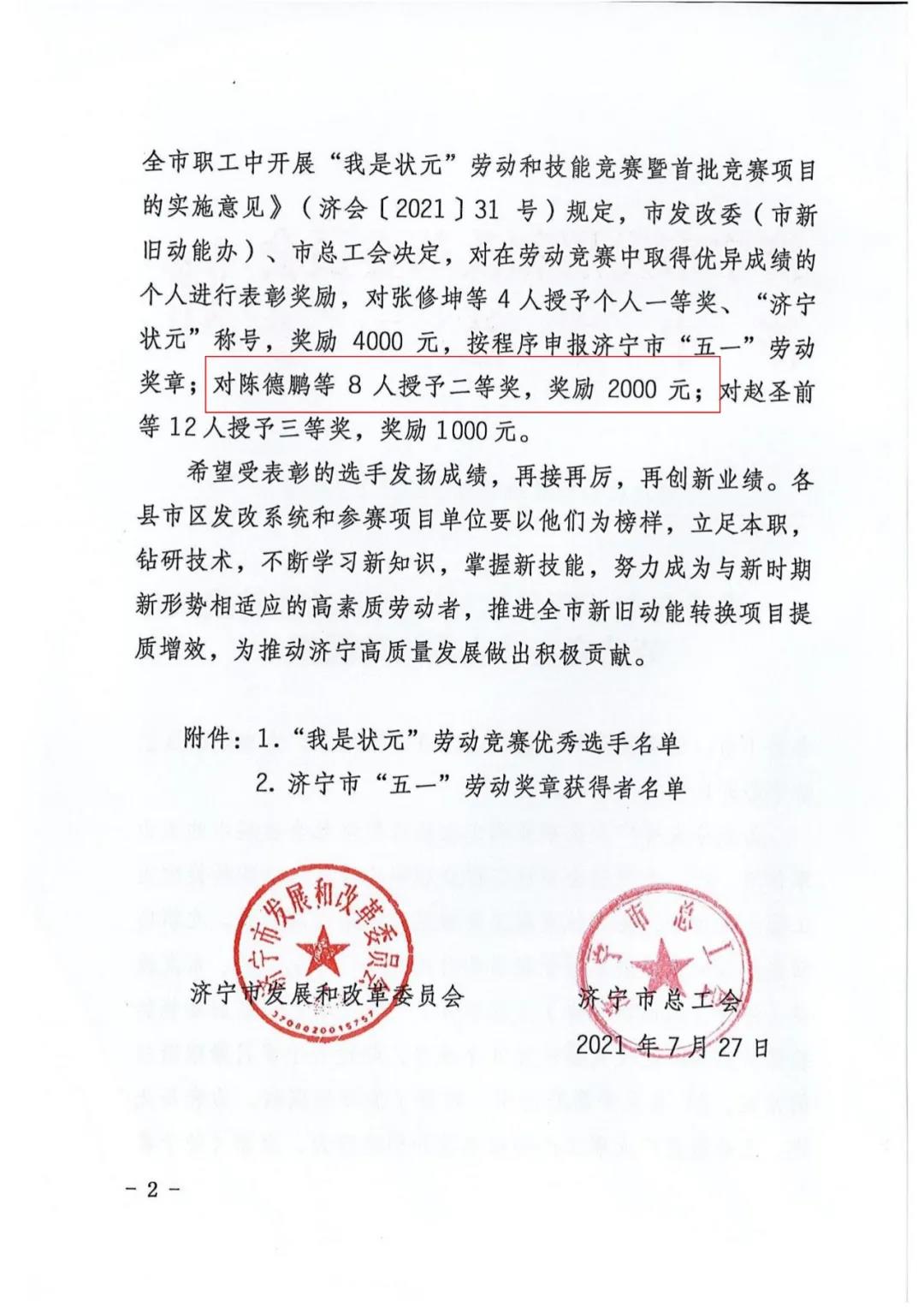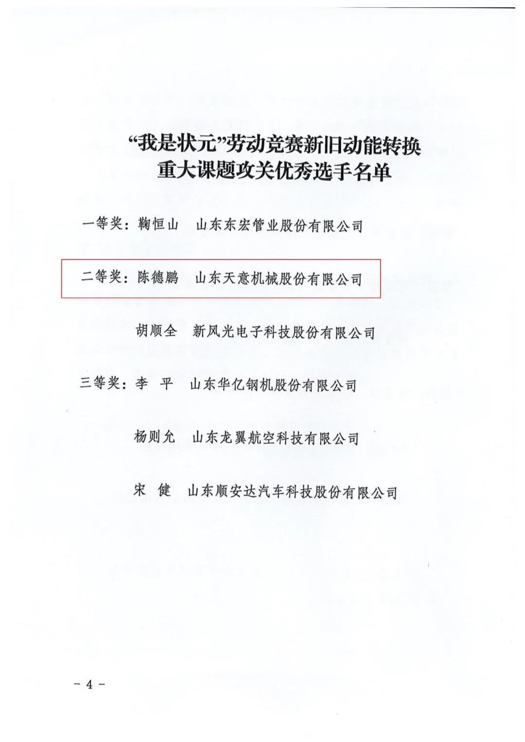我司陳德鵬獲得濟(jì)寧市“我是狀元”勞動競賽新舊動能轉(zhuǎn)換重大課題攻關(guān)競賽單元二等獎