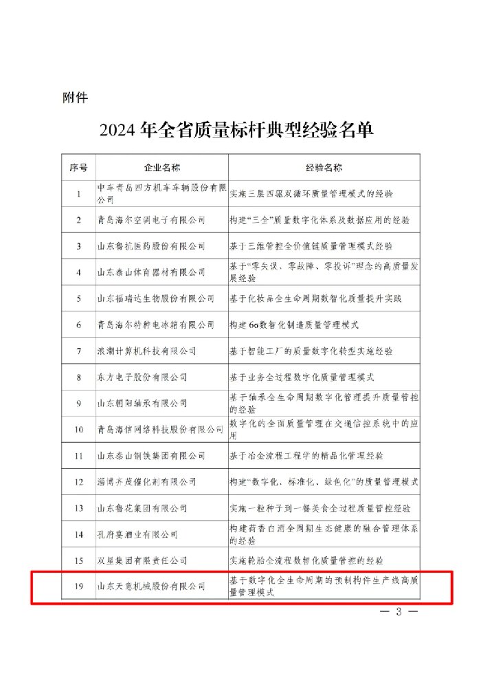 近日,山東省工業(yè)和信息化廳公布了全省質(zhì)量標(biāo)桿獎。天意機(jī)械憑借在關(guān)鍵過程質(zhì)量控制方向的不懈探索,以基于數(shù)字化全生命周期的預(yù)制構(gòu)件生產(chǎn)線高質(zhì)量管理模式斬獲“2024年全省質(zhì)量標(biāo)桿”。