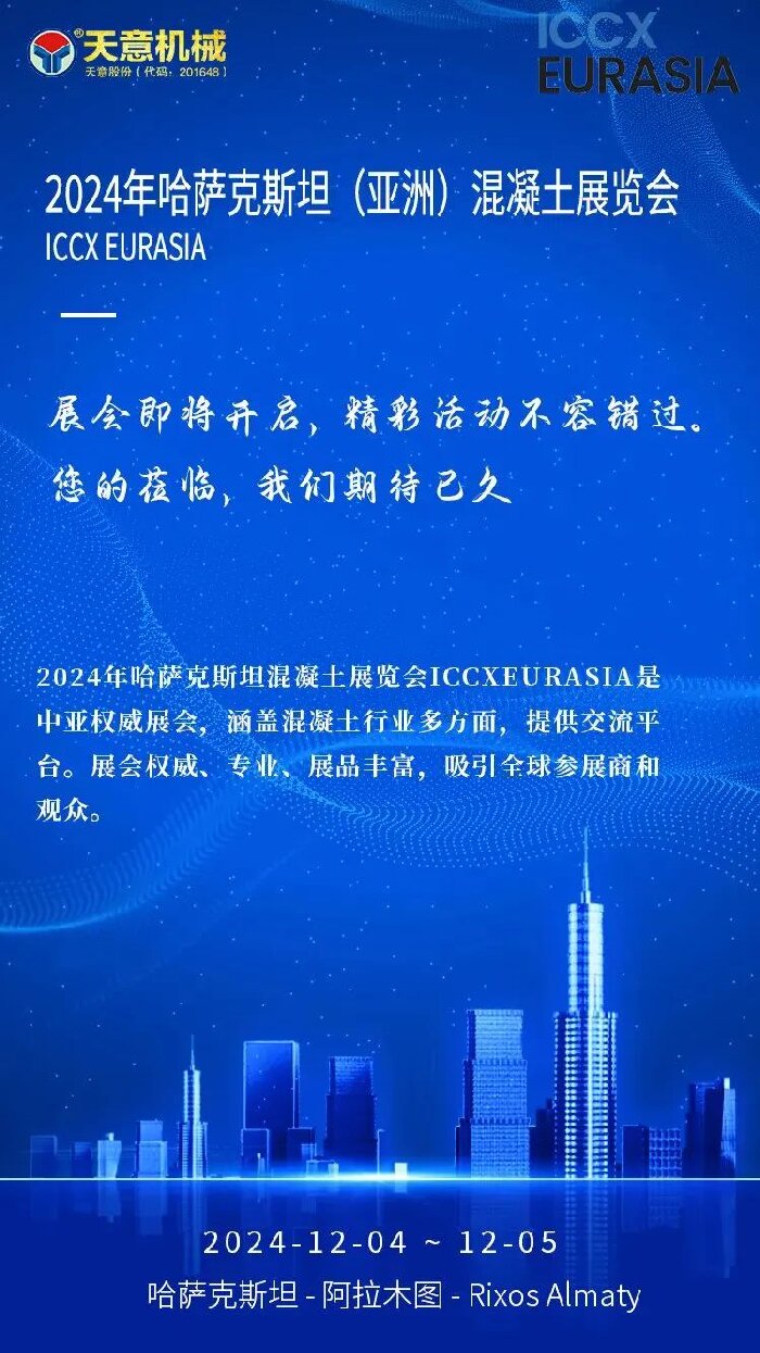 此次參加哈薩克斯坦混凝土展覽會,不僅是展示公司實力和技術(shù)的重要機會,更是開拓中亞市場、尋找合作伙伴的有效途徑。哈薩克斯坦作為中亞地區(qū)的重要國家,其建筑和基礎(chǔ)設(shè)施建設(shè)項目眾多,對混凝土產(chǎn)品的需求量大。天意機械將借此機會,深入了解中亞市場需求,積極尋求與當?shù)仄髽I(yè)和專業(yè)人士的合作機會,共同推動混凝土行業(yè)的發(fā)展。